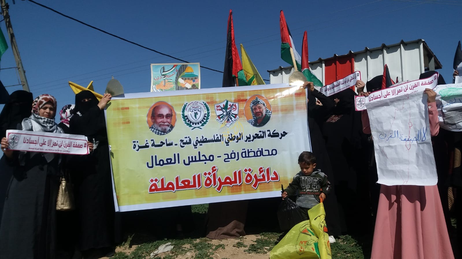 رفح: نظمت دائرة المرأة العاملة في مجلس العمال التابع لتيار الإصلاح الديمقراطي في حركة فتح، وقفة احتجاجية في مدينة رفح، ضد "صفقة ترامب" والمؤامرات التي تحاك ضد قضيتنا الفلسطينية.