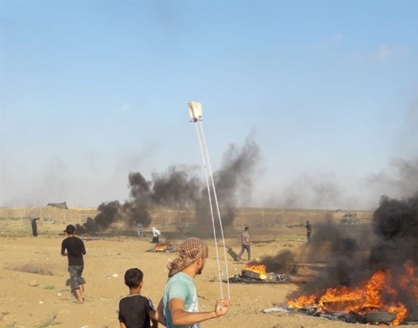 وأشعل الشبان إطارات السيارات ورجموا جنود الاحتلال بالحجار والزجاجات الفارغة ورفعوا الإعلام الفلسطينية مرددين شعارات تدعو لمواصلة مسيرات العودة حتى كسر الحصار.