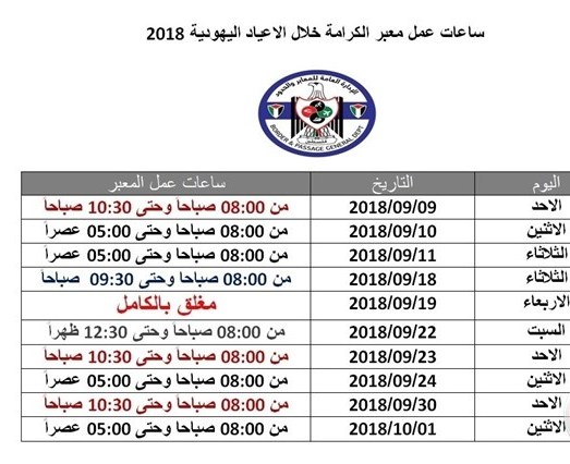 أريحا: أعلن نظمي مهنا مدير عام الإدارة العامة للمعابر والحدود في السلطة عن إجراء تعديل في ساعات العمل على معبر الكرامة، بسبب الأعياد اليهودية خلال أشهر أيلول وتشرين أول 2018.
