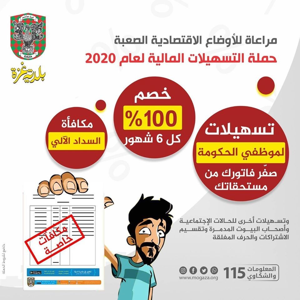 متابعات: أطلقت بلدية غزة، اليوم الأربعاء، حملة التسهيلات المالية لعام 2020 لكافة المواطنين والموظفين الحكوميين في المدينة، حيث بإمكان موظفي الحكومة تسديد الفاتورة من المستحقات.