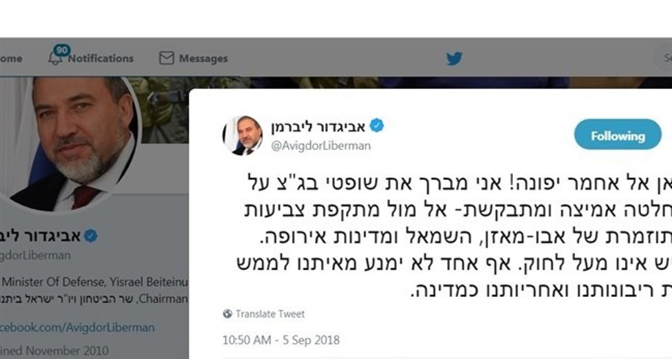 ووصف ليبرمان قرار الإخلاء والتهجير بـ"القرار الشجاع والضروري" من قبل "العليا" لمواجهة ما وصفه بـ"حملة النفاق المنظمة من قبل الرئيس الفلسطيني محمود عباس وقوى اليسار والدول الأوروبية".. وقال "لا احد فوق القانون.. ولن يمنعنا احد من ممارسة سيادتنا ومسؤوليتنا كدولة".