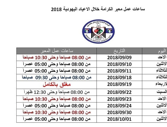 أريحا:  أعلن نظمي مهنا مدير عام الإدارة العامة للمعابر والحدود في السلطة عن إجراء تعديل في ساعات العمل على معبر الكرامة، بسبب الأعياد اليهودية خلال أشهر أيلول وتشرين أول 2018.