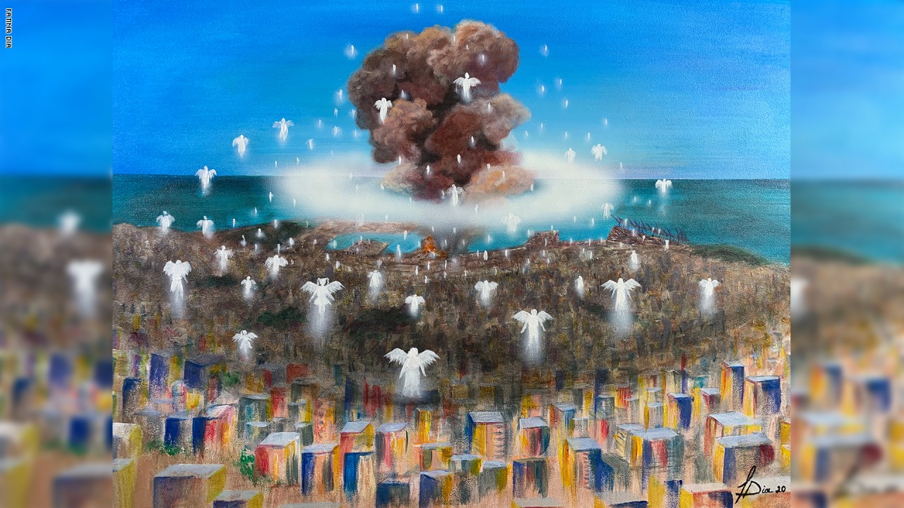 فيديو| الملائكة الصاعدة.. لوحة فنية تجسد كارثة بيروت