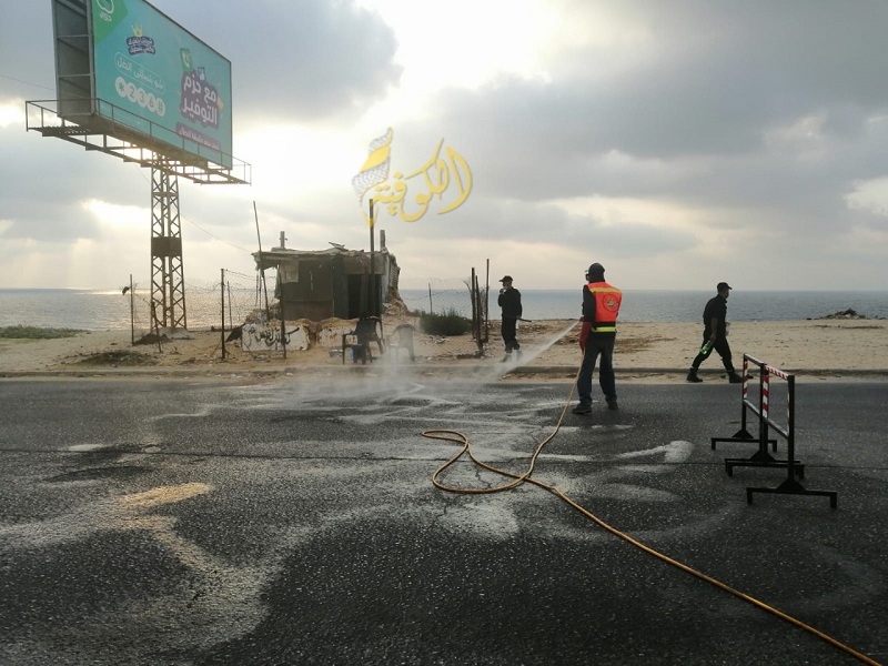 غزة: تواصل بلدية الزوايدة وسط قطاع غزة، اليوم الأحد، حملة تعقيم للمرافق العامة وبعض الشوارع الرئيسية والفرعية وأمام المحلات التجارية للحد من انتشار فيروس كورونا.