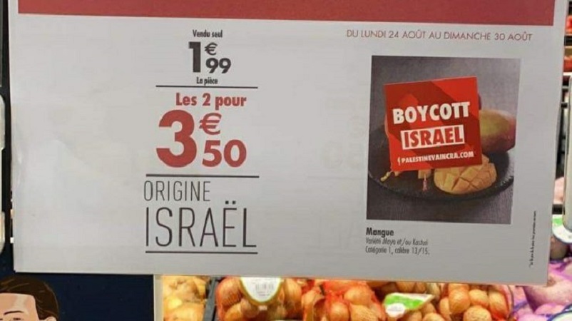 الرابطة نشرت صورة من متجر “كارفور” في بلدة أنسي جنوب شرق فرنسا، لمستهلك، يطالب بمقاطعة منتجات الفصل العنصري الإسرائيلية، وهو يضع ملصق صغير يميزها.