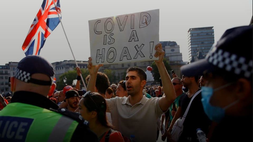 لندن: نظم الآلاف من البريطانيين، مظاهرة اليوم السبت، في ساحة الطرف الأغر بلندن، ضد الإجراءات الاحترازية للوقاية من فيروس كورونا المستجد "كوفيد19".