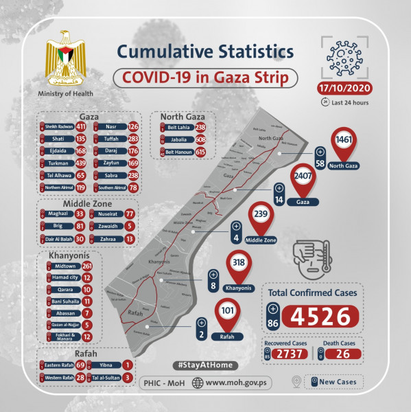 صحة غزة تنشر الخارطة الوبائية لمصابي كورونا اليوم السبت