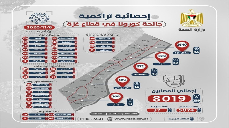 الخارطة الوبائية لفيروس كورونا في قطاع غزة اليوم الجمعة