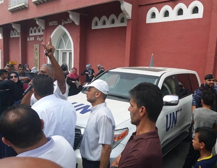 وحاصر المتظاهرون سيارة مسؤول الأمن الخاص لمدير عمليات الأونروا شمالي أمام الفندق، بعد أن وصلت المفاوضات مع إدارة "الأونروا" إلى طريق مسدود.