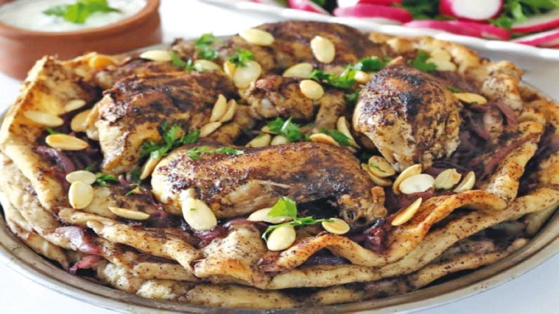 المسخن: أكلة شعبية تتكون من خبز الطابون المغطي بالدجاج والبصل المقلي، وزيت الزيتون والسماق.
