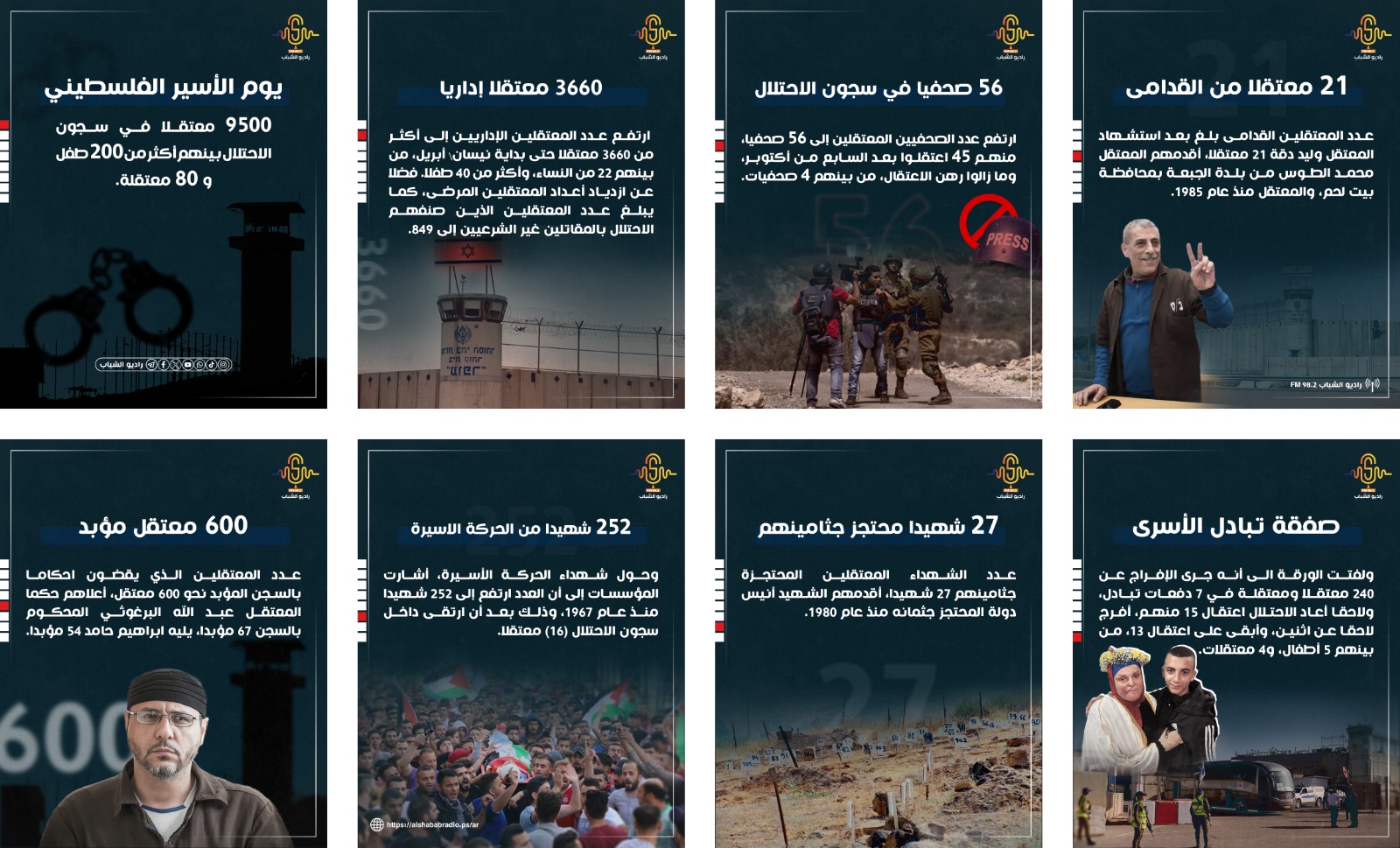 الصحفيين: بلغ عدد حالات الاعتقال بين صفوف الصحفيين بعد السابع من أكتوبر (66) صحفيًا، تبقى منهم رهن الاعتقال (45)، جرى تحويل (23) منهم إلى الاعتقال الإداريّ.